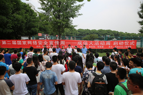 中午,主题为“共建网络安全、共享网络文明”的宣传启动仪式在银杏大道举行,学校党委副书记敬枫蓉,宣传统战部、保卫处、信息中心,学生处、信息安全工程学院负责人以及各学院学生代表参加了启动仪式。