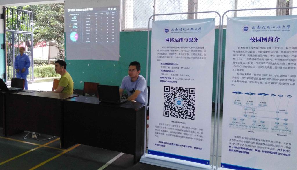 为确保迎新工作的顺利进行,信息中心根据学校的统一安排,提前进行了精心准备。在航空港校区和龙泉校区,信息中心临时架设了迎新办公现场的无线网络,保障了现场办公网络的需求,又部署了大屏幕、投影仪等设备进行报到信息的实时显示,制作了相关的校园网介绍和网络服务说明,全新全意为迎新工作服务。在报到现场,信息中心派驻了多名工作人员,随时为迎新工作进行现场技术支持与业务咨询。同时中心与中国电信、移动等运营商进行了充分地沟通,协调运营商派驻通信保障车辆进行现场的移动电话网络保障。目前,相关工作有序、顺利开展。