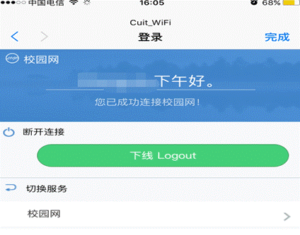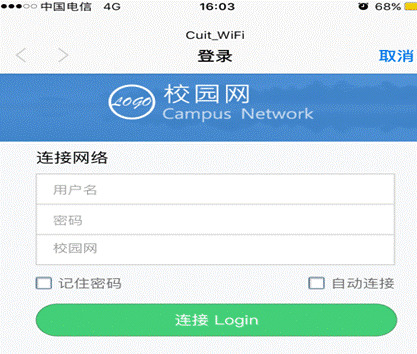 开通了移动、联通或教育网宽带的同学,可以免费试用图书馆无线网(电信宽带用户暂时无法使用,信息中心正在与中国电信加紧协商),无线信号为Cuit_WiFi,选择相应的运营商网络登录,用户名和密码为宿舍上网的用户名和密码。界面示意图如下: