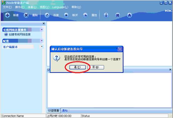 7.点击上图中的图标运行iNode智能客户端。用户电脑首次安装该软件时,会自动提醒创建连接,如下图所示,点击“是”以继续。