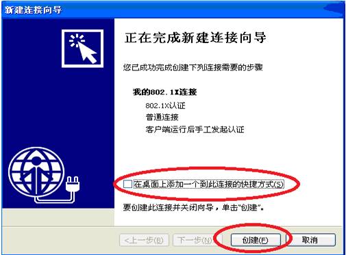 注意:“选择网卡”的下拉框内可能有多个选项,请选择“本地连接”显示型号的网卡。如若不清楚应该选择哪一个网卡,请在连接创建完成后,右键点击“我的802.1X连接”,选择“属性”,选择不同的网卡进行上网认证进行测试。